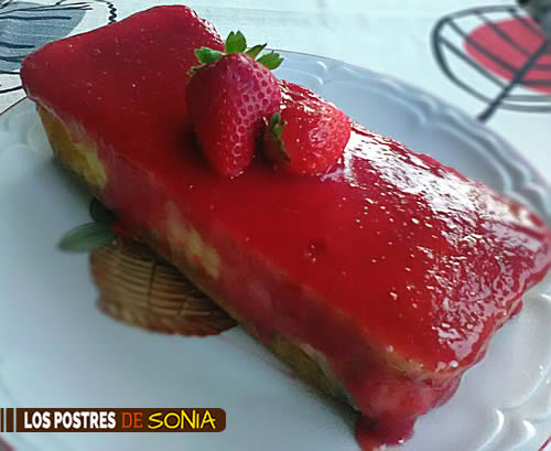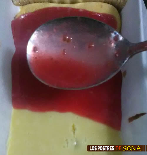 Pasado el tiempo de reposo le pondremos por encima la mermelada, a la que le echaremos una hojita de gelatina previamente en caliente . Se puede utilizar una mermelada ta hecha, pero nosotros hicimos una de frambuesas y fresas con vainilla que le iba de lujo.