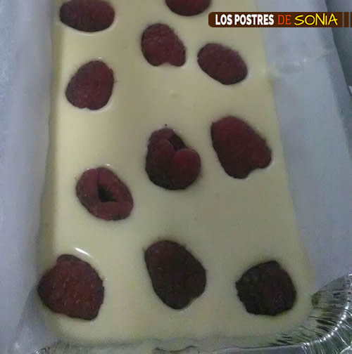 Echaremos nuestra mezcla sobre la base fría, después pondremos las frambuesas, procura hundir las frambuesas para que no se vean, porque ellas solas no se hunden.