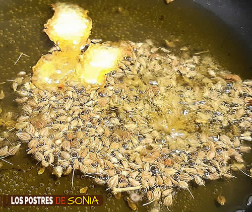 Ponemos en una sartén los el aceite y calentamos, añadimos la piel del limón y freímos hasta que se empiecen a dorar los bordes , lo retiramos del fuego y aprovechando el calor residual para poner el anís para que aromatice el aceite. Removemos bien, colamos y reservamos para más tarde.