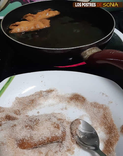 Una vez lista la masa vamos haciendo pequeñas bolitas, después en una superficie lisa estiramos con un rodillo y las dejamos finitas.Esta masa no se pega por el aceite que lleva, por eso no necesitarás poner harina en tu superficie de trabajo, pero si quieres puedes poner un poquito de aceite extendido y así no tendrás problema.Una vez estirada la masa, unimos los dos extremos metiendo el dedo por el centro, poniendo un poco de agua y presionando bien la unión para que no se abran al freírlos.