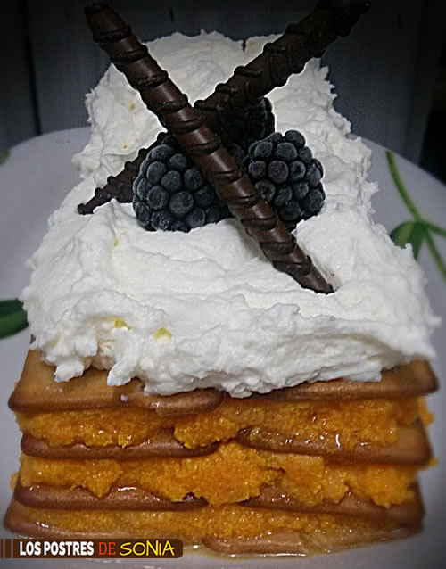 Pondremos una capa de crema de zanahoria. Vuelve a poner encima una capa de galletas. Y así sucesivamente hasta acabar con toda la crema, acabando en una capa de galletas.