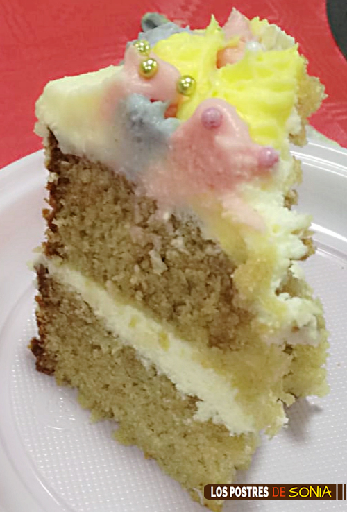 Mojaremos nuestro bizcocho con un almíbar de vainilla (agua y azúcar a igual cantidad, esencia vainilla , hervir 5 min y dejar enfriar) y lo dejaremos reposar mientras preparamos nuestro frosting.