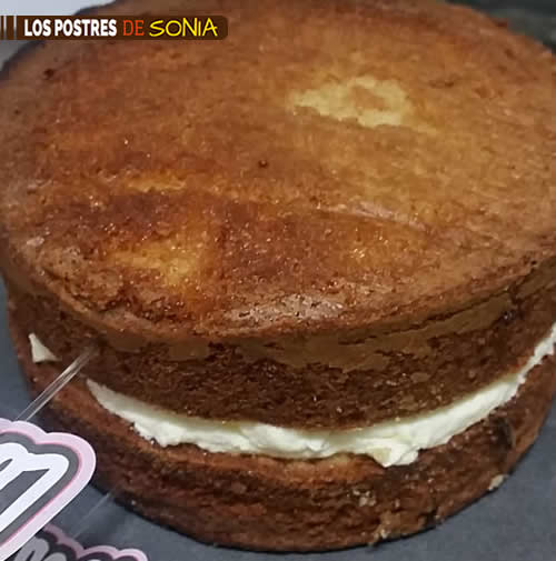 Ahora cogeremos nuestro bizcocho que lo abriremos con mucho cuidado por la mitad.
